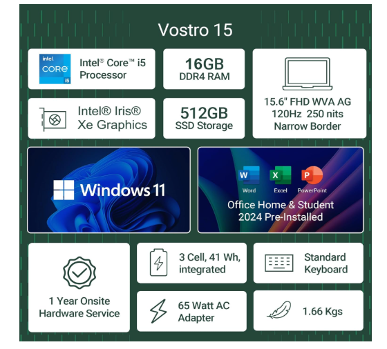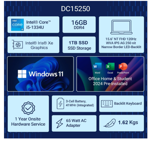 Dell 15 (Previously Inspiron), 13th Gen Intel Core i5-1334U (16GB RAM, 1TB SSD) FHD, Anti-Glare 15.6"/39.62cm, Windows 11 MSO'24, Silver, 1.62kg, 12 Month McAfee, Thin & Light, Backlit Keyboard Laptop