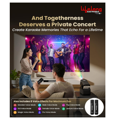 Lifelong Electronics ROAR Projector with 2 Mics | Booming 20W Speakers | Cricket Commentary, Karaoke Party & Room Cinema | 1080P & 4K Ultra HD Support | All Android OTT Apps | Ultra Bright 150” Screen